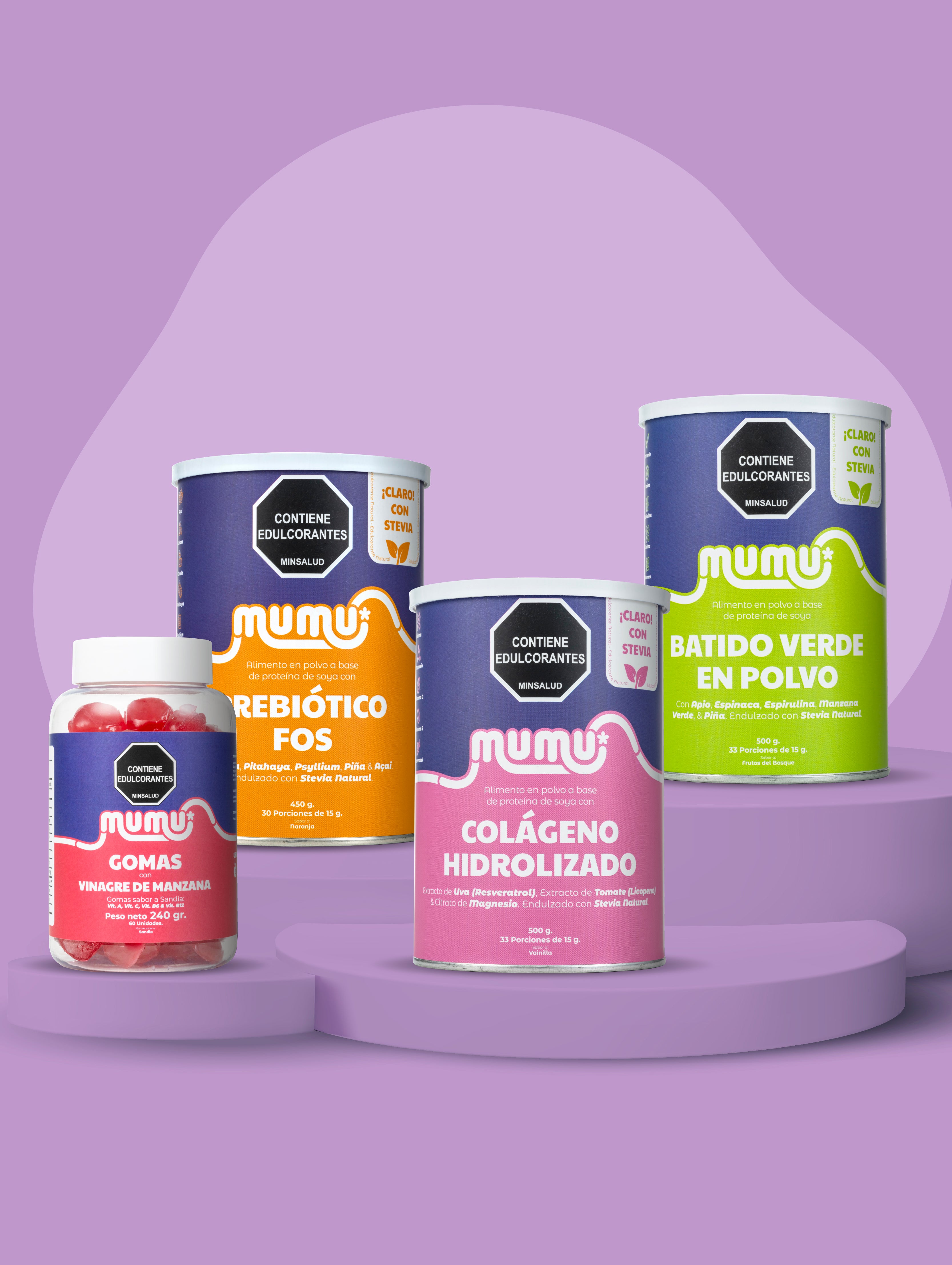 El Combo Renueva incluye Fibra con prebióticos, Colágeno Hidrolizado (vainilla), Batido Verde, Gomitas de Vinagre de Manzana.