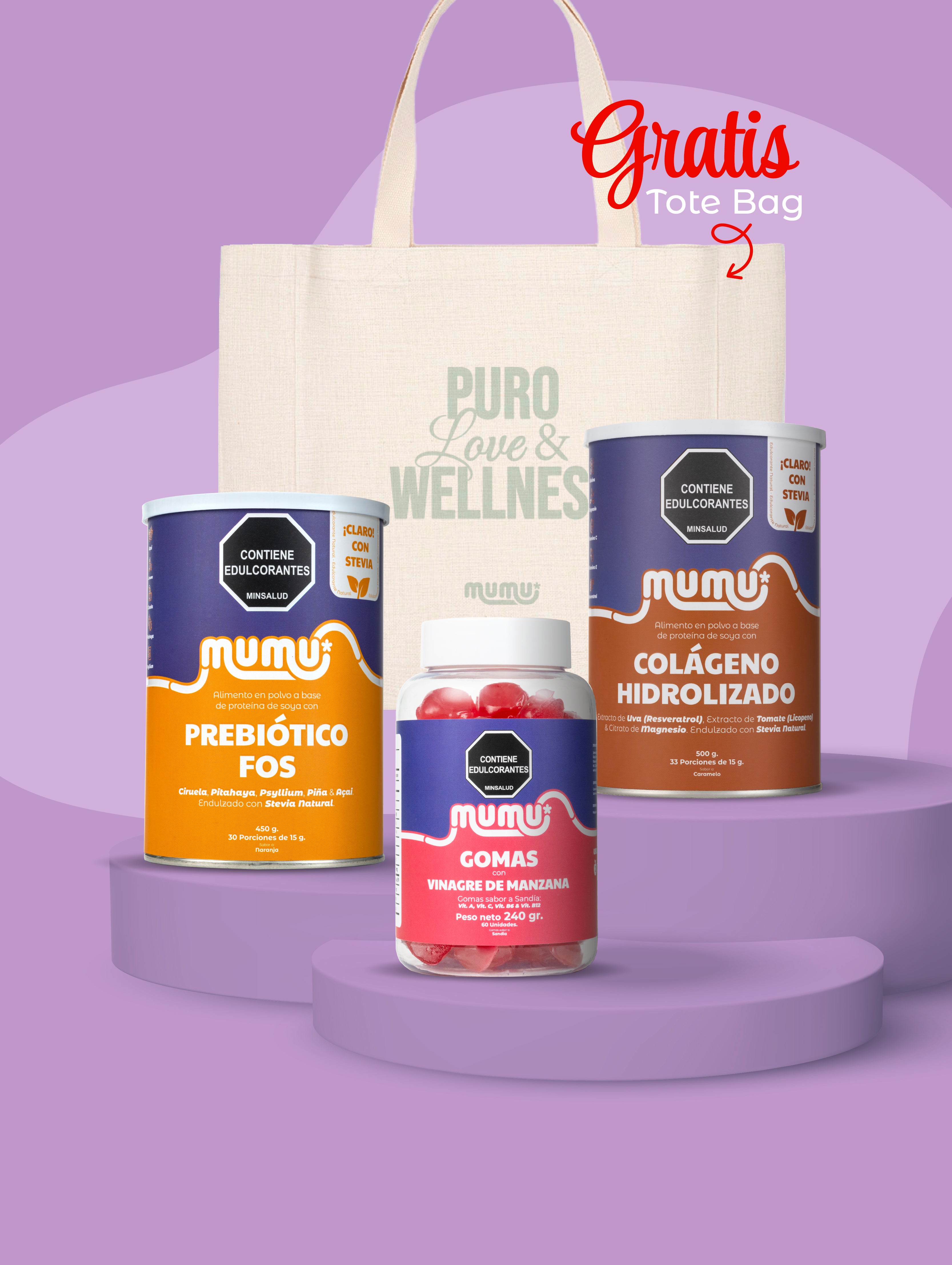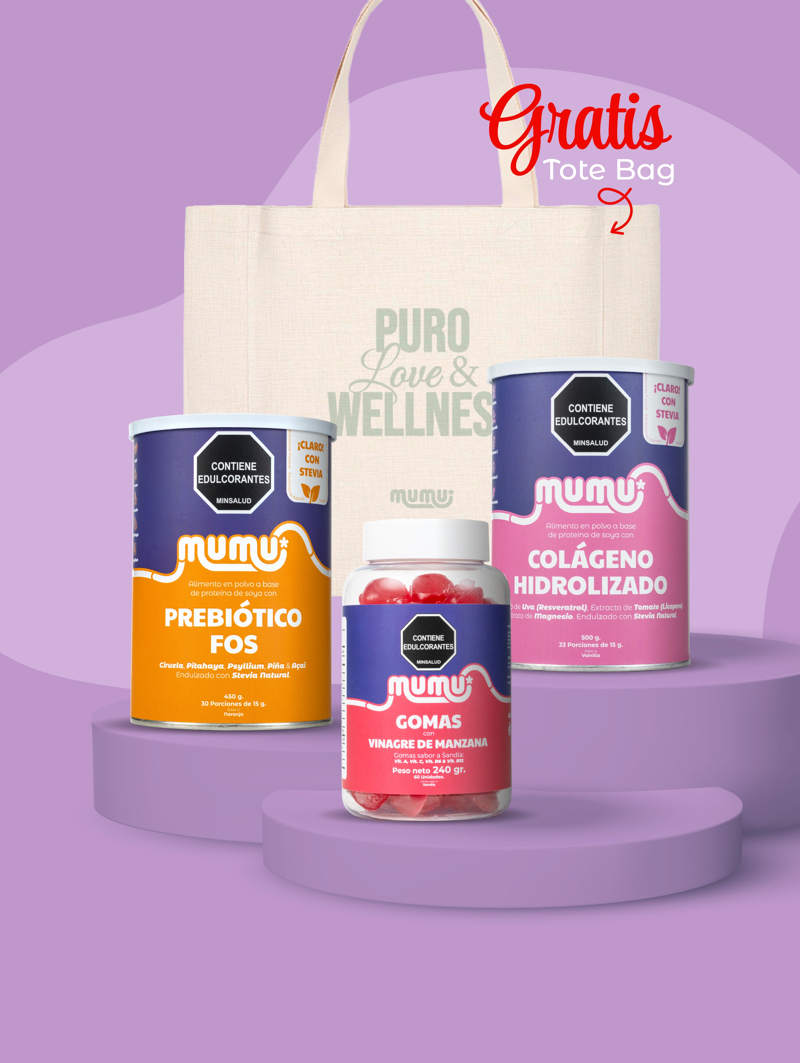 El Combo Libera incluye Colágeno Hidrolizado, Fibra con prebióticos FOS, Gomitas de Vinagre de Manzana, para cuidar tu digestión y nutrición.