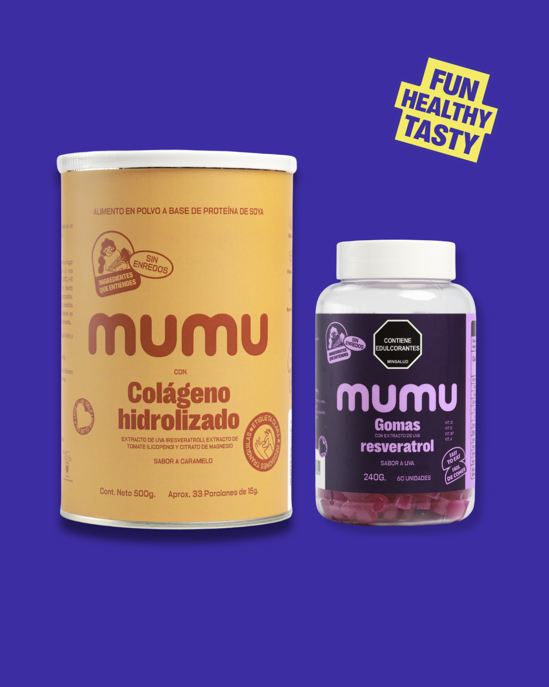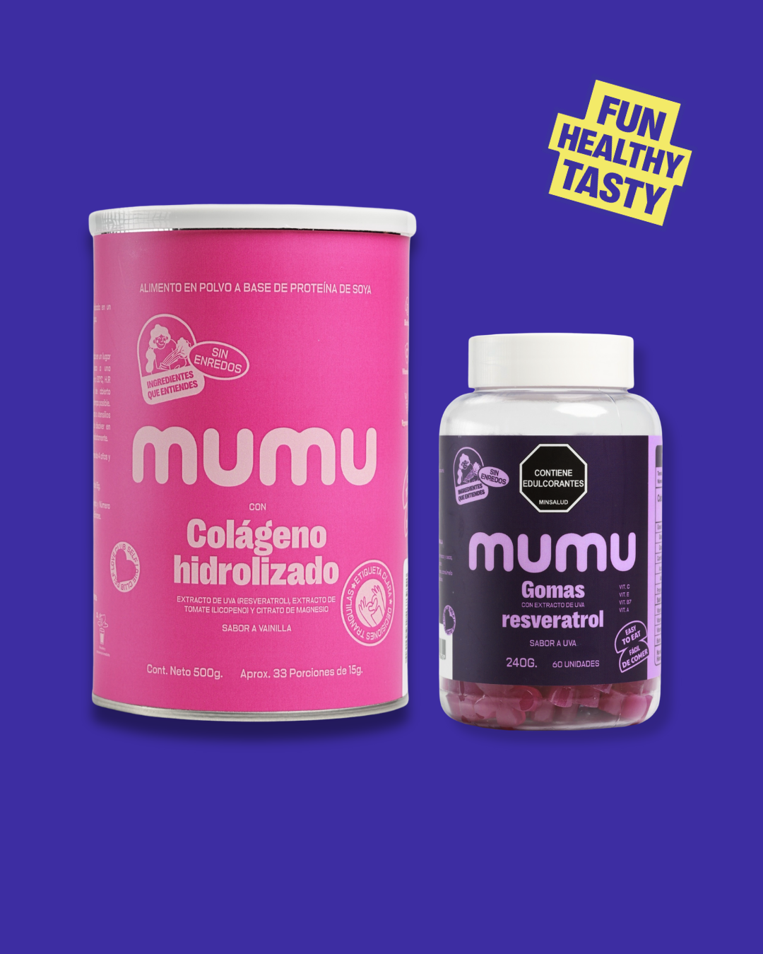 Incluye Colágeno Hidrolizado y Gomitas de Resveratrol, para apoyar la salud de tu piel.